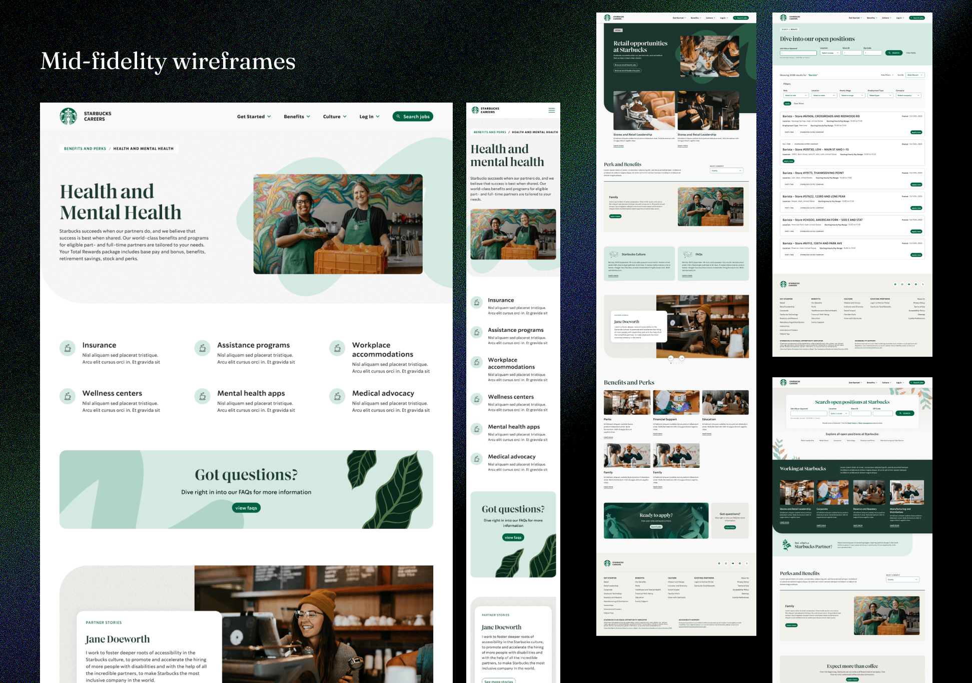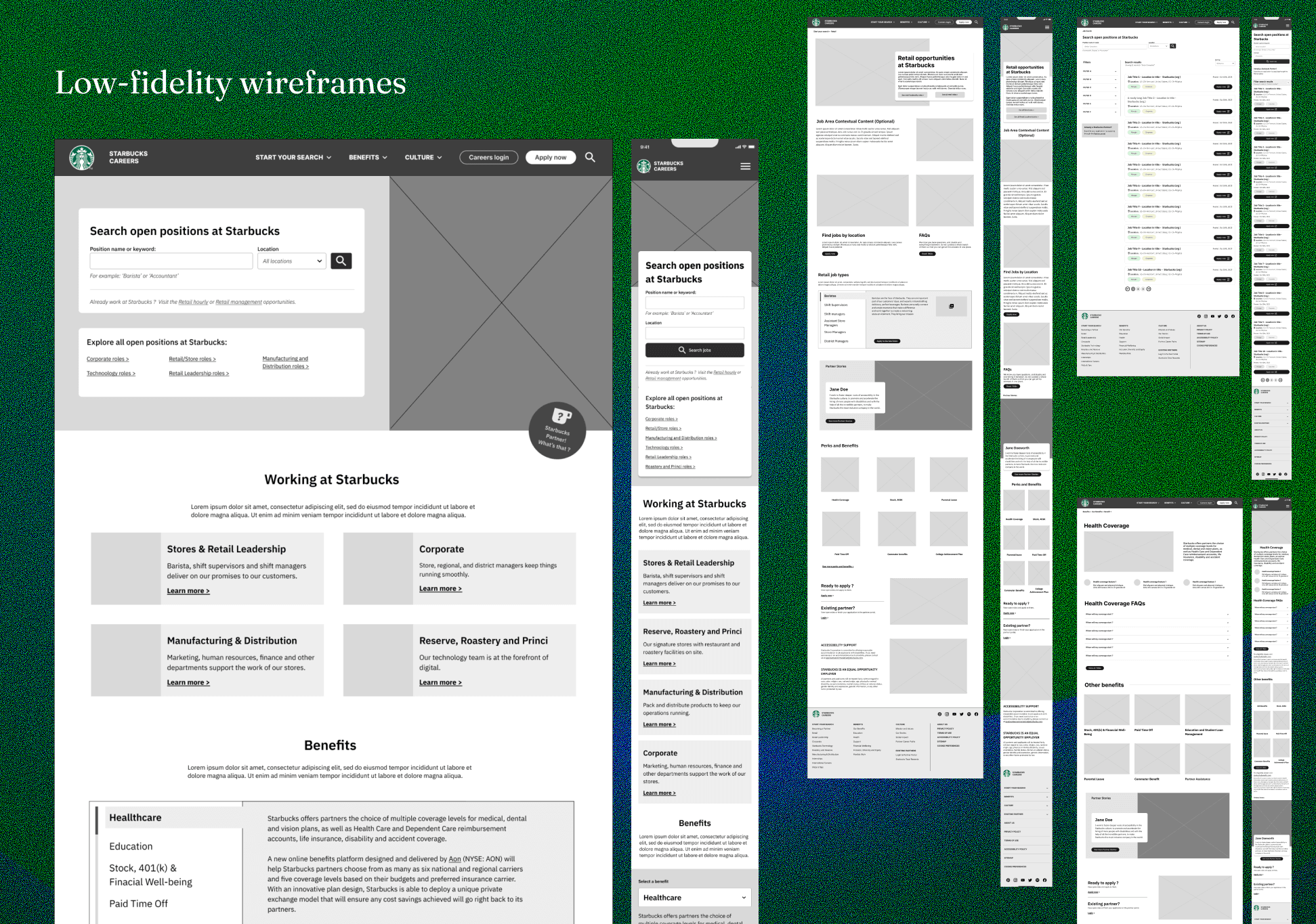 Content structure was explored through wireframes in parallel with visual design strategy developed via moodboards, allowing the team to quickly converge on design language and guidelines. Multiple rounds of wireframe-level redesigns enabled testing and refinement of the information architecture, ensuring that navigation, search, and access to openings and benefits information were straightforward before committing to high-fidelity design.