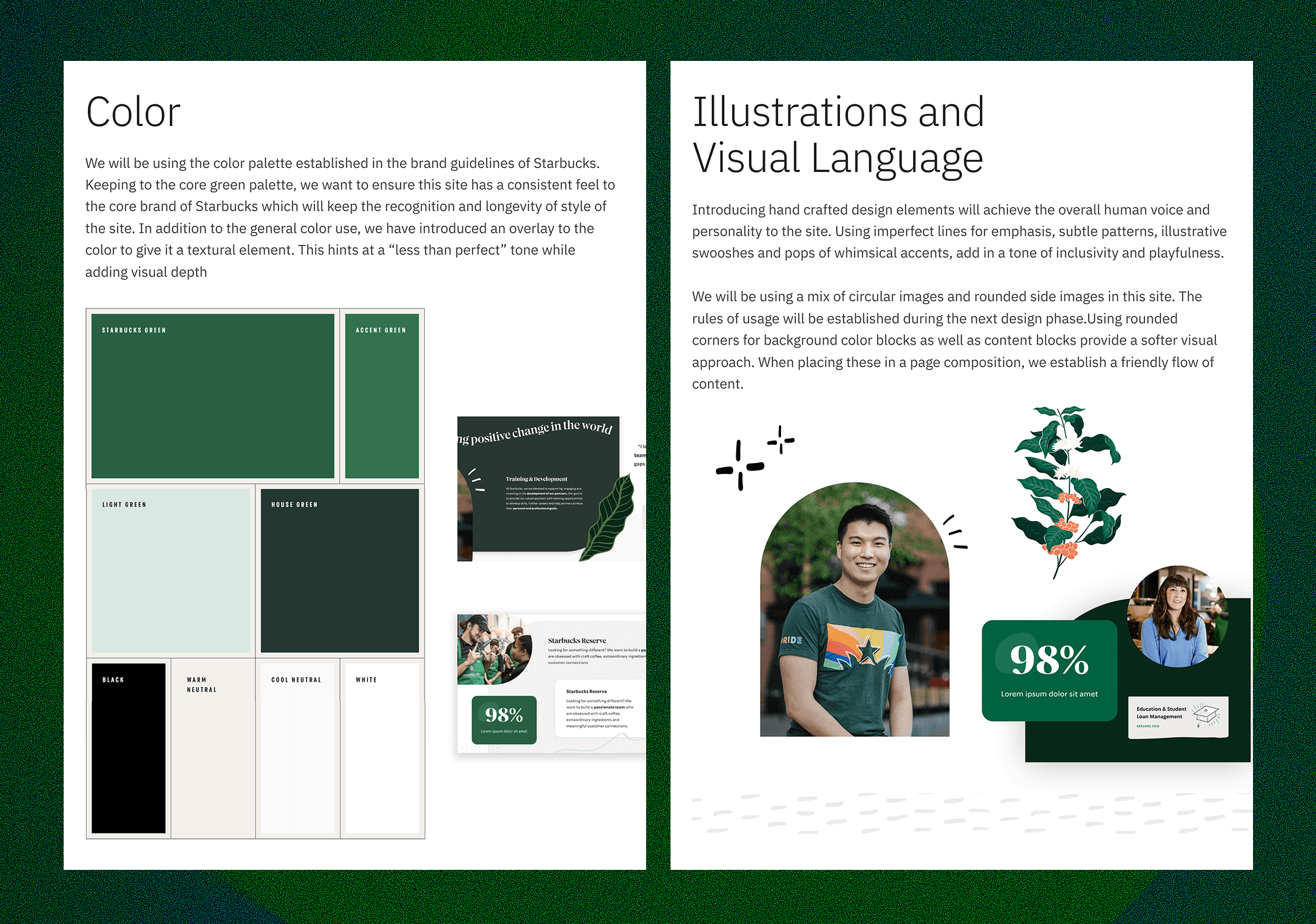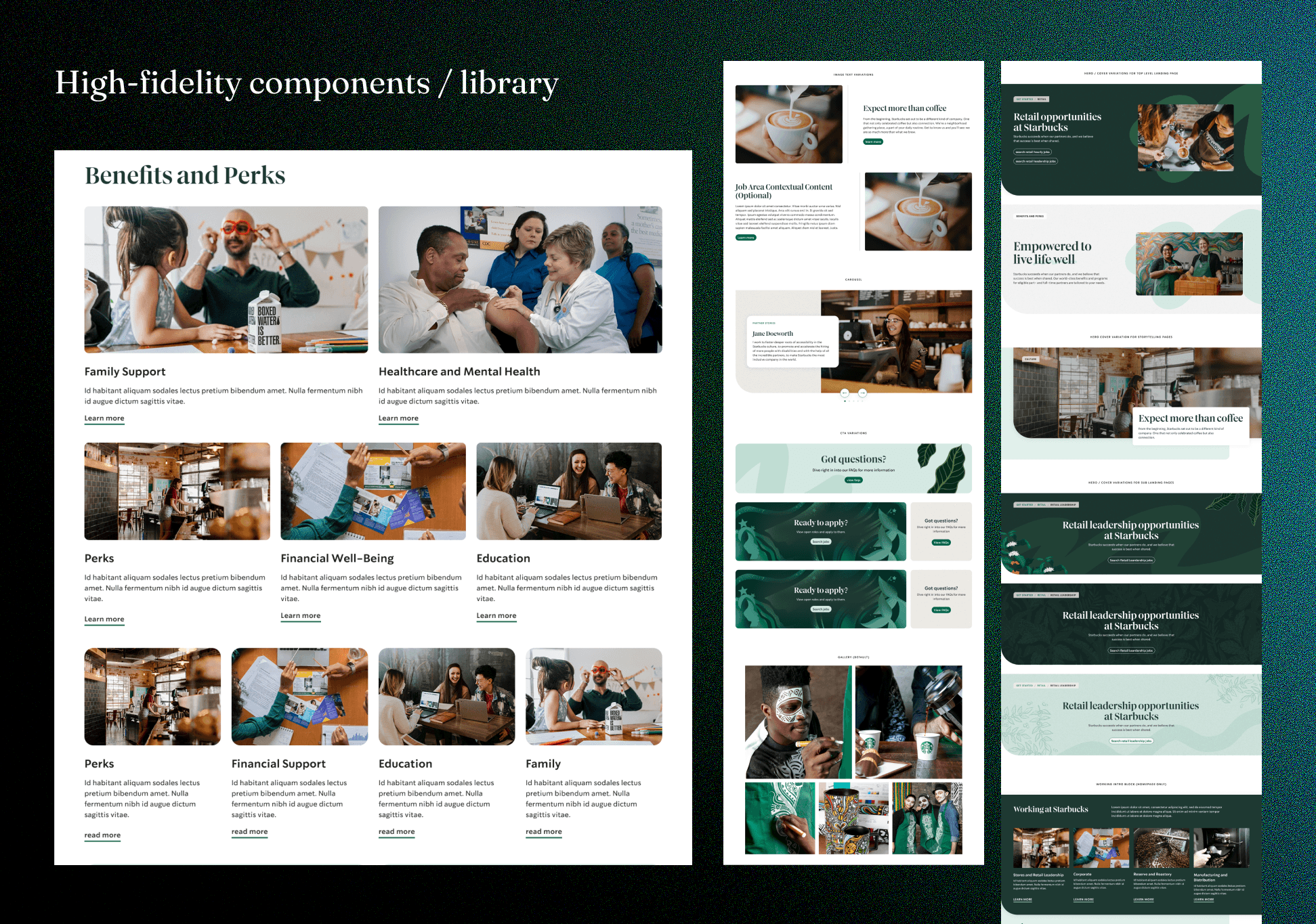 Once the IA and flows were validated, the team designed a library of reusable page components that could be easily themed for different campaigns or hiring needs using configurable colors, illustrations, and styling. These components were built to work in a plug-and-play model with the CMS, enabling Starbucks to compose new pages and experiences without breaking content structure or consistency.
