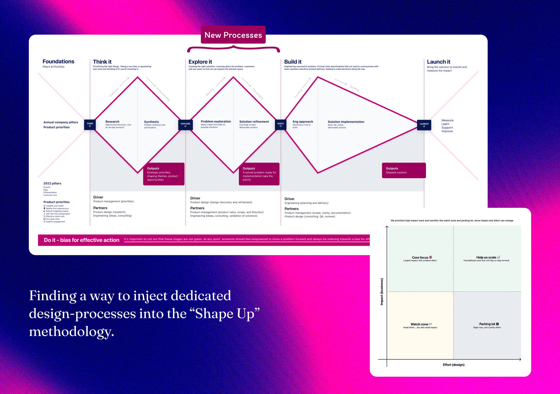 As Lead Designer on a newly formed team, I spearheaded the adoption of Basecamp’s "Shape Up" methodology to integrate design into the product workflow. By shifting "shaping" and planning to run parallel to building, we fostered early collaboration between design and engineering, establishing robust processes that ensured high-quality output without slowing down development.