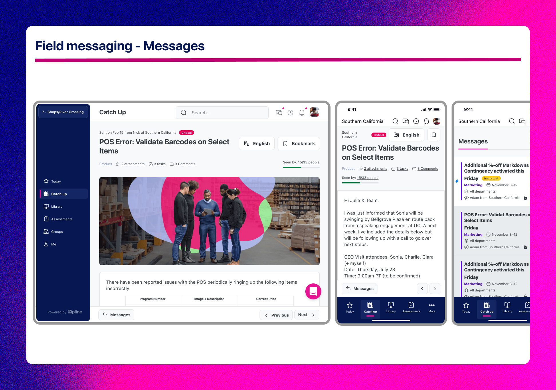 Zipline is a retail operations platform designed to bridge the gap between headquarters and the frontline, unifying communications and task management for distributed teams. Used by major brands to drive store execution, the platform serves employees in high-pressure environments where software must be an enabler, not a distraction.